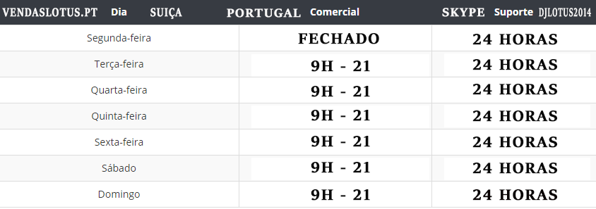 Atenção o nosso departamento comercial só funciona dentro do horário assinaldo na tabela. O nosso departe de suporte é feito via skype  e djlotus2014. Atenção skype poderam demorar entre 10 a 15 minutos a serem respondidos dependedo do caso.